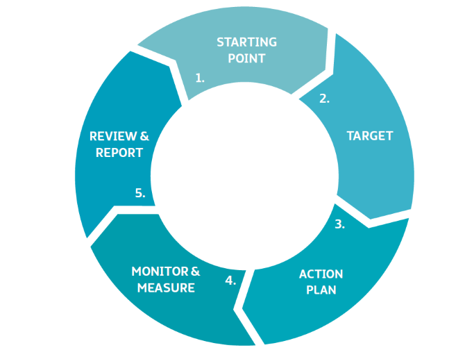 Assuming that managerial support exists, the diagram below shows a good approach to energy management. You will see that it is the same cycle that would apply to the management of any process or system within your business.